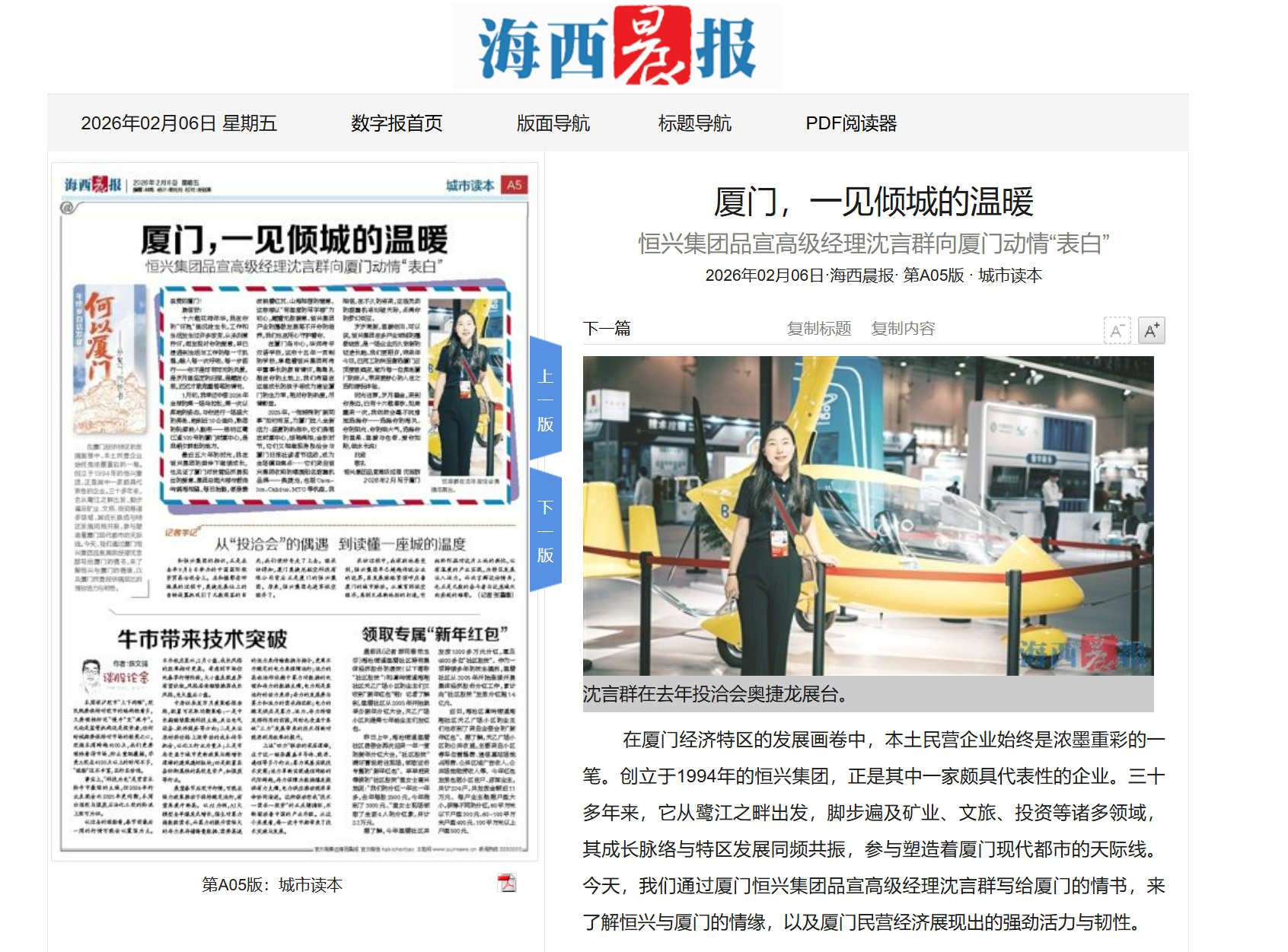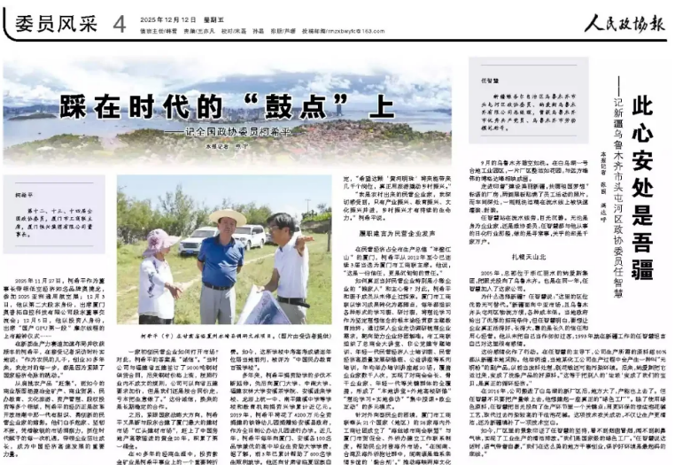 【人民政協(xié)報(bào)】2025年12月12日,人民政協(xié)報(bào)專訪柯希平文章《踩在時(shí)代的“鼓點(diǎn)”上》,刊登于第4版“委員風(fēng)采”欄目,照寧記者手記《致敬民營企業(yè)家,致敬奮斗者》同步刊登??孪F剑旱谑?、十三、十四屆全國政協(xié)委員,廈門市工商聯(lián)主席,廈門恒興集團(tuán)有限公司董事長。2025年11月27日,柯希平作為董事長帶領(lǐng)低空經(jīng)濟(jì)知名品牌奧捷龍,參加2025亞洲通用航空展;12月3日,他以第二大股東身份,出席廈門奧普拓自控科技有限公司股東董事交流會(huì);12月5日,他以投資人身份,出席“國產(chǎn)GPU第一股”摩爾線程的上市敲鐘儀式……在新質(zhì)生產(chǎn)力賽道加速布局并收獲頗豐的柯希平,在接受記者采訪時(shí)樸實(shí)地說:“作為農(nóng)民的兒子,創(chuàng)業(yè)30多年來,我走對(duì)的每一步,都是因?yàn)榫o跟了國家經(jīng)濟(jì)命脈的跳動(dòng)?!睆募缣艮r(nóng)產(chǎn)品“趕集”,到如今的商業(yè)版圖涵蓋冶金礦產(chǎn)、商業(yè)貿(mào)易、民辦教育、文化旅游、資產(chǎn)管理、股權(quán)投資等多個(gè)領(lǐng)域,柯希平的經(jīng)歷正是改革開