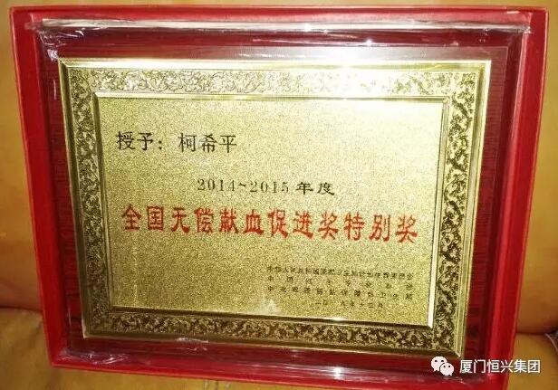 6月10日,廈門(mén)市中心血站代表國(guó)家衛(wèi)計(jì)委,向柯希平董事長(zhǎng)頒發(fā)“2014-2015年度全國(guó)無(wú)償獻(xiàn)血促進(jìn)獎(jiǎng)特別獎(jiǎng)”。據(jù)悉,全省僅1人獲此殊榮?!盁o(wú)償獻(xiàn)血促進(jìn)獎(jiǎng)”由國(guó)家衛(wèi)計(jì)委組織,每?jī)赡暝u(píng)選一次,授予長(zhǎng)年為普及無(wú)償獻(xiàn)血知識(shí),弘揚(yáng)無(wú)償獻(xiàn)血人道主義精神,營(yíng)造無(wú)償獻(xiàn)血良好社會(huì)氛圍,推動(dòng)我國(guó)無(wú)償獻(xiàn)血事業(yè)作出突出貢獻(xiàn)的單位和個(gè)人,是無(wú)償獻(xiàn)血事業(yè)的國(guó)家級(jí)榮譽(yù)。