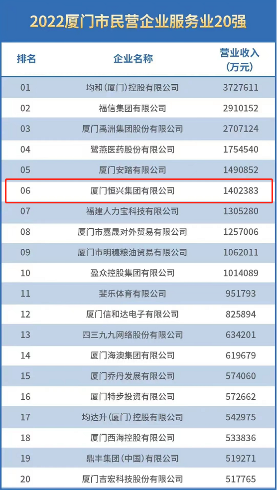 廈門恒興集團(tuán)有限公司入榜“2022年廈門市民營企業(yè)百強(qiáng)”,位居榜單第10位;入榜“2022廈門市民營企業(yè)服務(wù)業(yè)20強(qiáng)”,位居該榜第6位。??