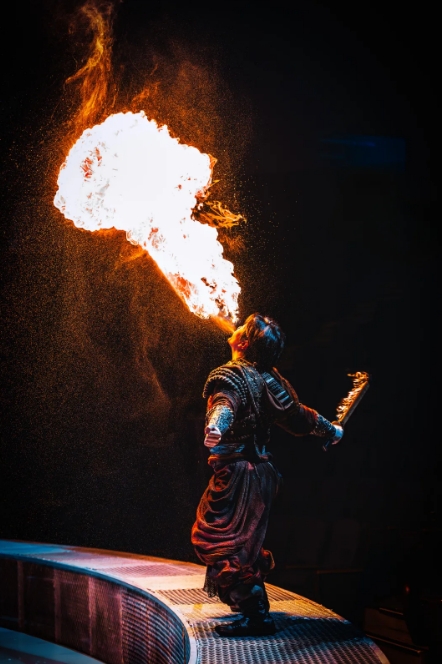 “本次升級(jí),我們采用“天幕地屏+激光投影”的立體舞臺(tái)設(shè)計(jì),打破了傳統(tǒng)演出的空間限制,給觀眾帶來(lái)前所未有的沉浸式體驗(yàn)。”導(dǎo)演閔銳接受采訪時(shí)說(shuō),“《王的戰(zhàn)車》以北方部落的古老傳說(shuō)為藍(lán)本,將傳統(tǒng)技藝與現(xiàn)代科技巧妙融合。比如縵吊演員的表演象征著部落信仰的升華,而噴火表演則象征著勇士的熾熱斗志。整場(chǎng)演出既保留了傳統(tǒng)雜技的力量與驚險(xiǎn),又通過(guò)全息投影技術(shù)等科技手段賦予其全新的藝術(shù)表達(dá),希望觀眾在觀演的過(guò)程中,除了感受到震撼,也能體會(huì)到中國(guó)傳統(tǒng)文化的深厚底蘊(yùn)與傳承。